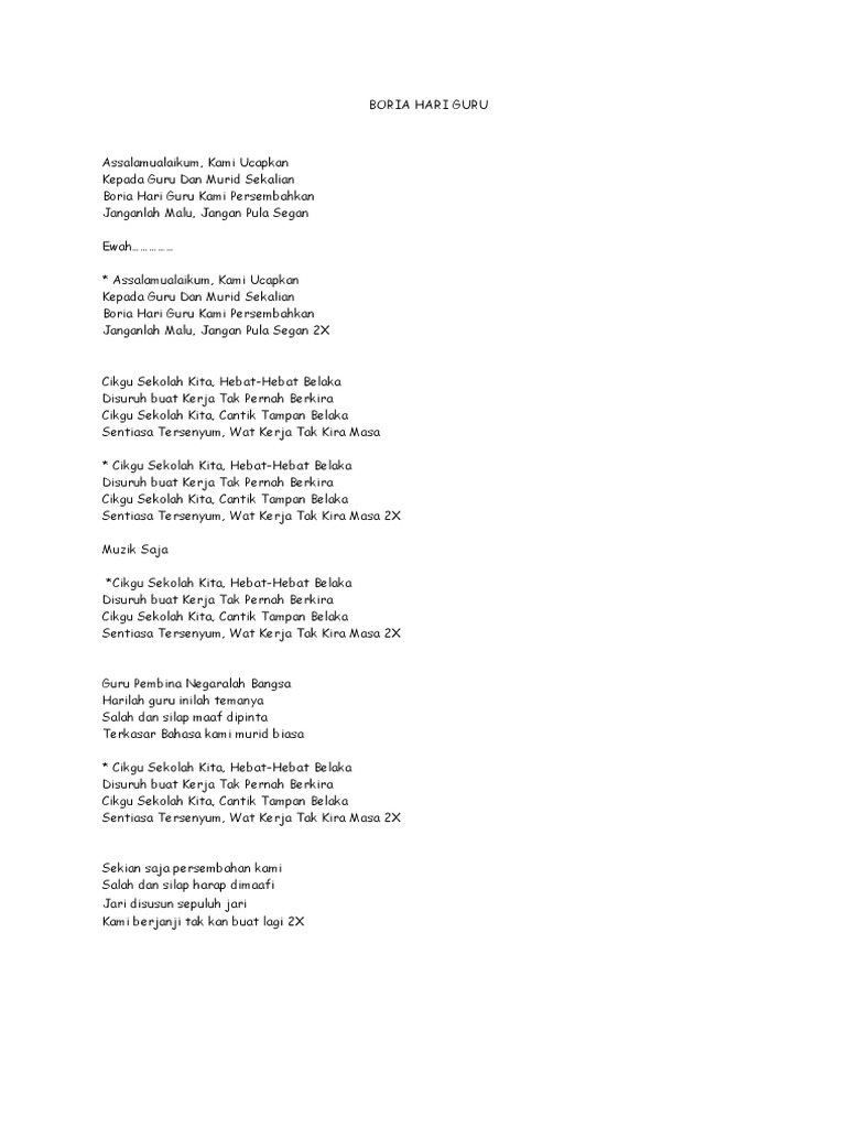 Seorang guru memberikan arahan kepada siswa saat pengumpulan tugas di sd negeri 2 tlogolele, tlogolele, selo, boyolali, jawa tengah, senin antara foto/aloysius jarot nugroho. Lirik lagu boria 2019 hidup ceria tanpa dadah assalamualaikum, salam sejahtera jari disusun maaf dipinta seloka hari guru pembuka kata untuk tatapan guru tercinta *korus : Pastikan boria hari ini mengikut boria tradisi. Sartono terpujilah wahai engkau ibu bapak guru namamu akan selalu hidup dalam sanubariku semua baktimu akan kuukir di dalam hatiku sebagai prasasti terima kasihku tuk pengabdianmu engkau post navigation. Dikarang oleh hafizi tajuddin pada 10:52 ptg.